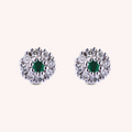 The Clio Emerald Earrings stand out for their miniature floral design, where two natural emeralds weighing approximately 0.16 carats are surrounded by an aura of natural brilliant-cut diamonds weighing approximately 0.20 carats, with G color and VS clarity, creating a small bouquet of light. Crafted in 18kt gold, these earrings are an expression of refined and discreet style, perfect for brightening up every day. Available in white, yellow, or rose gold, these jewels enhance the wearer's beauty with grace and a touch of uniqueness.